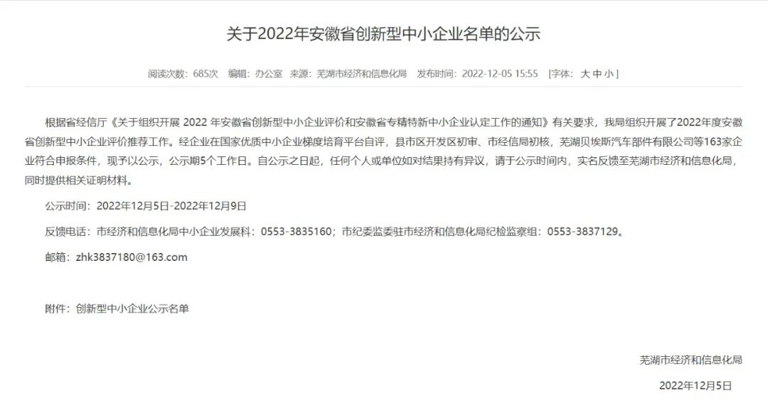 12月5日,芜湖市经信局公布了2022年安徽省创新型中小企业名单。安徽ty8天游平台登录成功通过审核,被认定为安徽省创新型中小企业!
