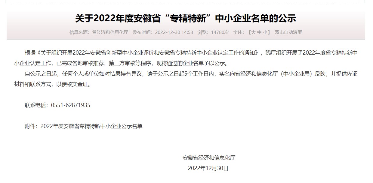 ? ? ? ? ?近日,安徽省经信厅公布了2022年安徽省“专精特新”中小企业名单。安徽ty8天游平台登录成功通过审核,被认定为安徽省“专精特新”中小企业!