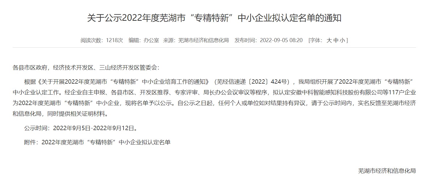9月5日,芜湖市经信局公布了 2022年度芜湖市“专精特新”中小企业认定名单,经过7天的公示期,安徽ty8天游平台登录信息技术有限公司等117家企业被认定为2022年度芜湖市“专精特新”中小企业。