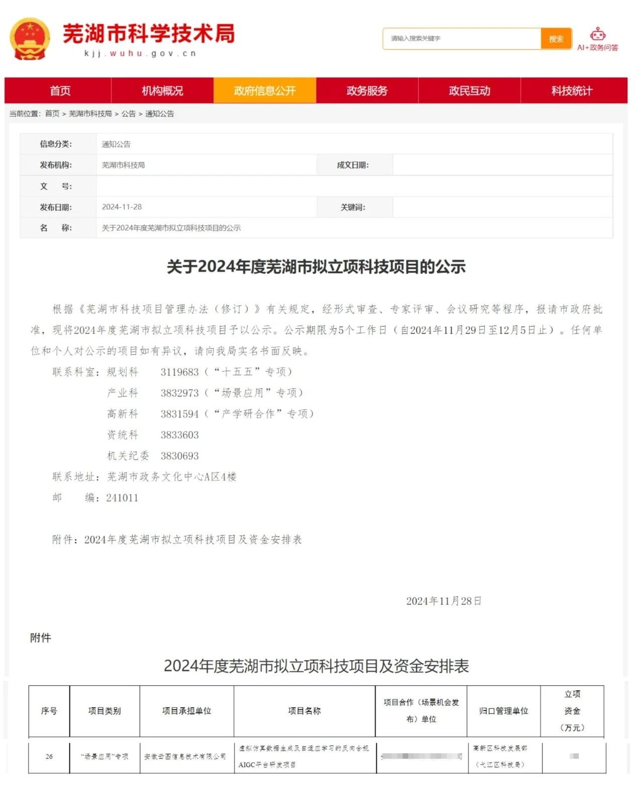? ? ? 2024年11月28日,安徽ty8天游平台登录信息技术有限公司凭借在仿真数据合成领域的深厚积累,申报的“虚拟仿真数据生成及自适应学习的反向合规AIGC平台研发项目”近日正式被纳入2024年度芜湖市科技局立项科技项目!此次成就不仅是对我司科研实力的认可,更是芜湖市科技局对促进本地科技创新环境和支持高新技术企业发展所作出的积极回应。